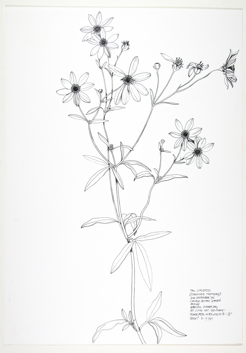 Notes: From Wild Flowers of the North Shore series; Tall Coreopsis (Coreopsis tripteris). 2nd September '95 Chicago Botanic Garden Prairie Beautiful summer day Hot, sunny not too sunny-flower/petal width length 1.5-1.75" height 3-9 feet