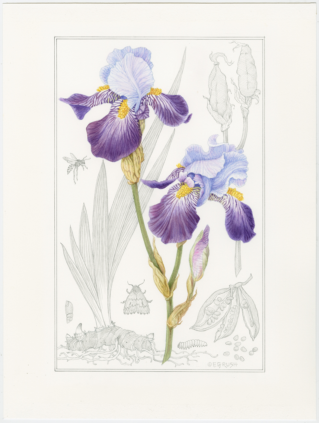 Description: watercolor iris with graphite pencil iris details and insects in background and surrounding