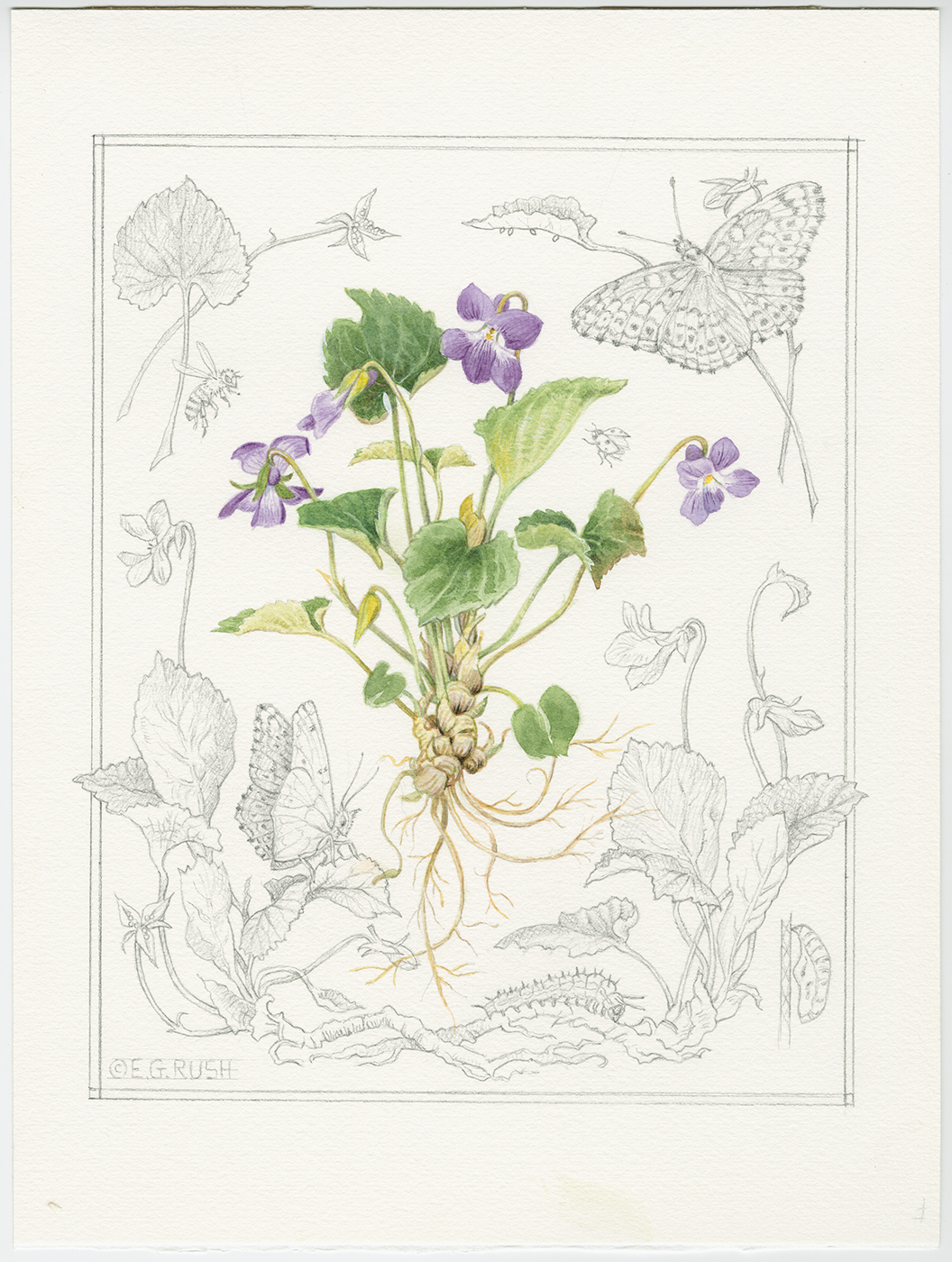 Description: watercolor violet with graphite pencil plant details and fritillary butterfly with different life stages in background and surrounding