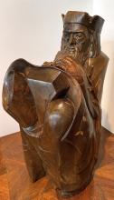 Description: carved wooden sculpture of scribe illuminating a manuscript with leafy vine
