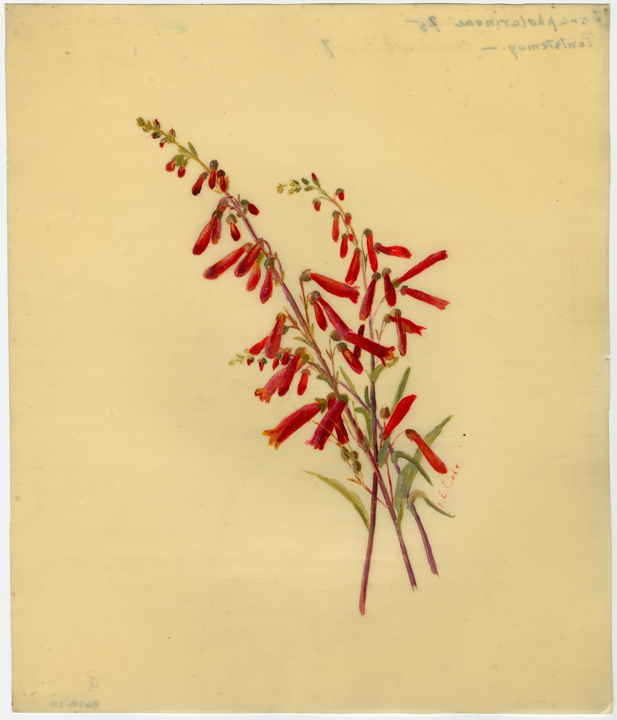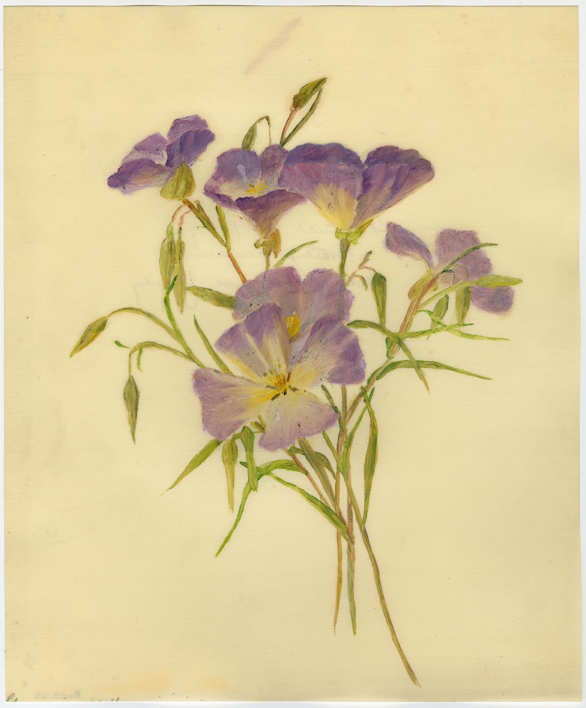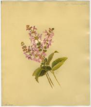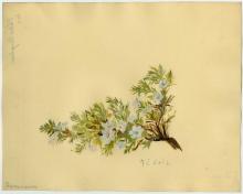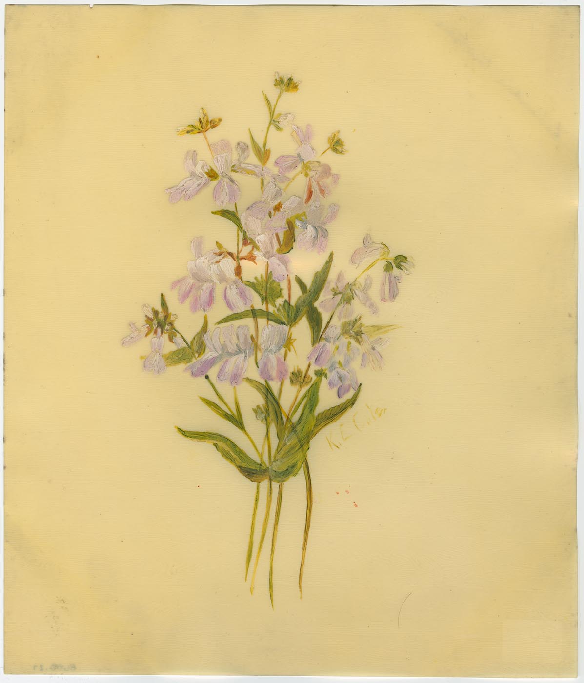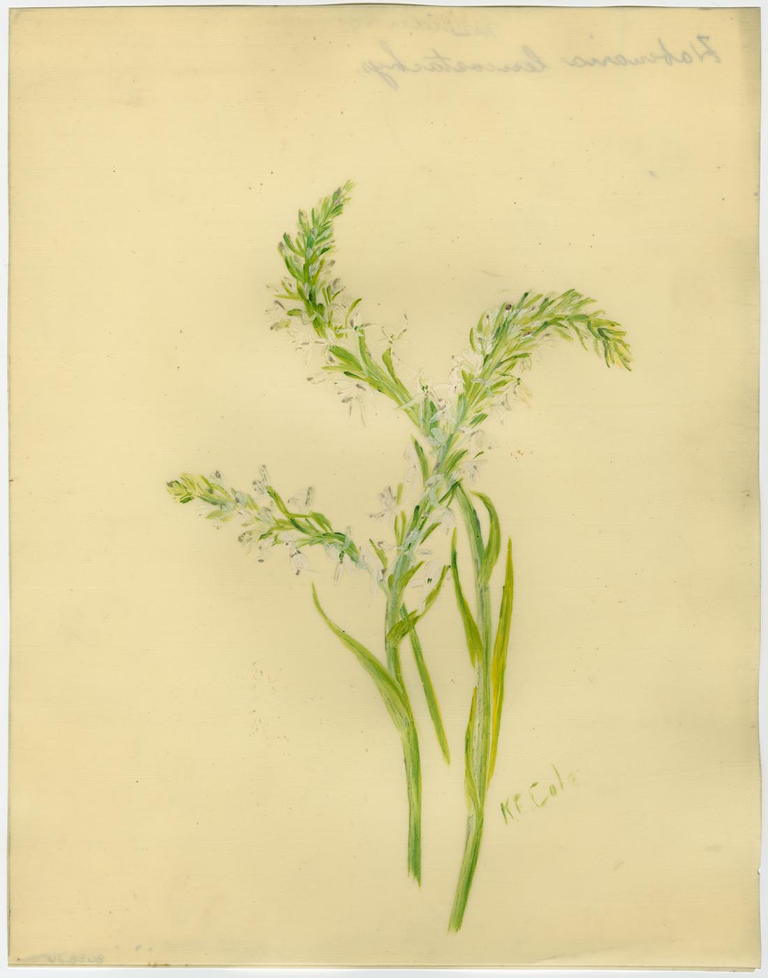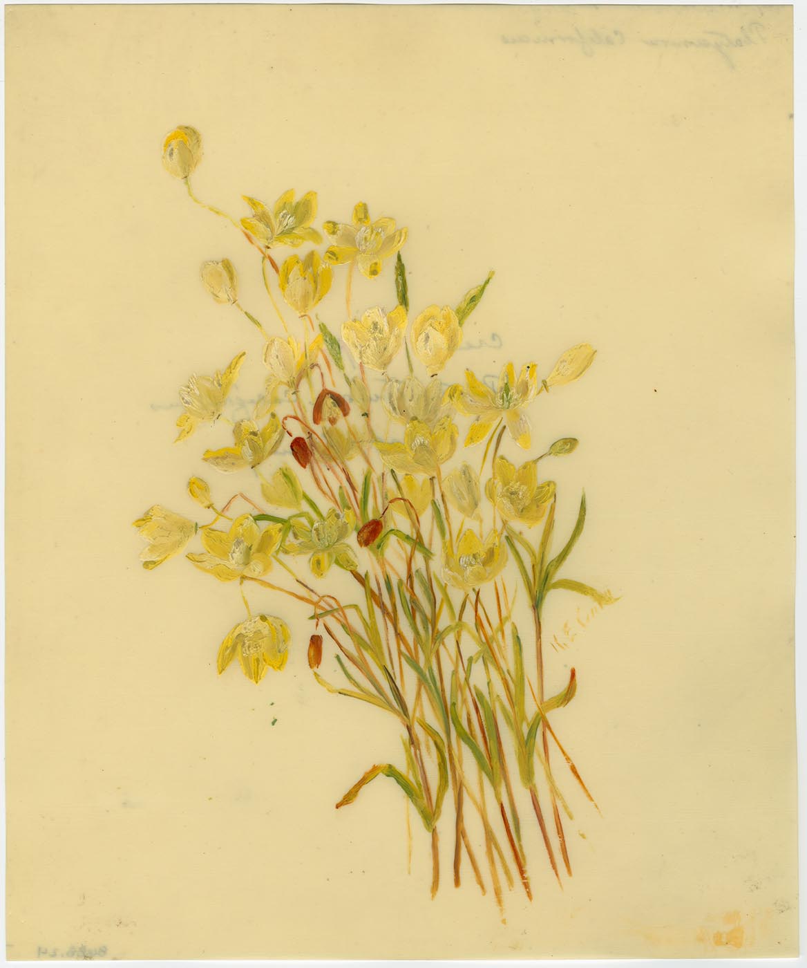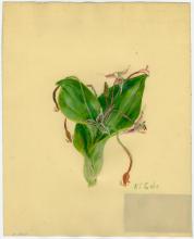 Notes: painted on celluloid, possibly "ivorine" or similar grained celluloid brand of synthetic faux vellum; painted on the shiny uncoated side of sheet; "17 Liliaceae, Lily Family, Scoliopus Bigelovii, Shade of Redwoods, Marin Co. north Jan. Apr" in ink on label adhered to back